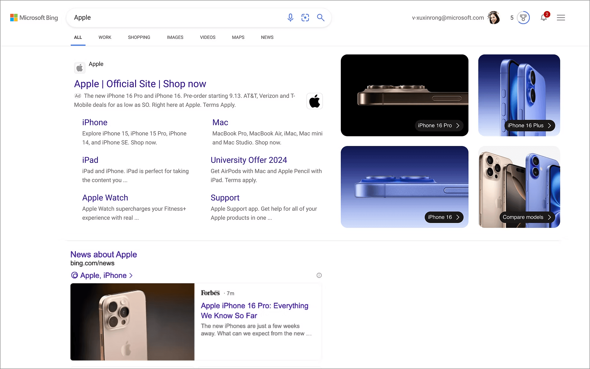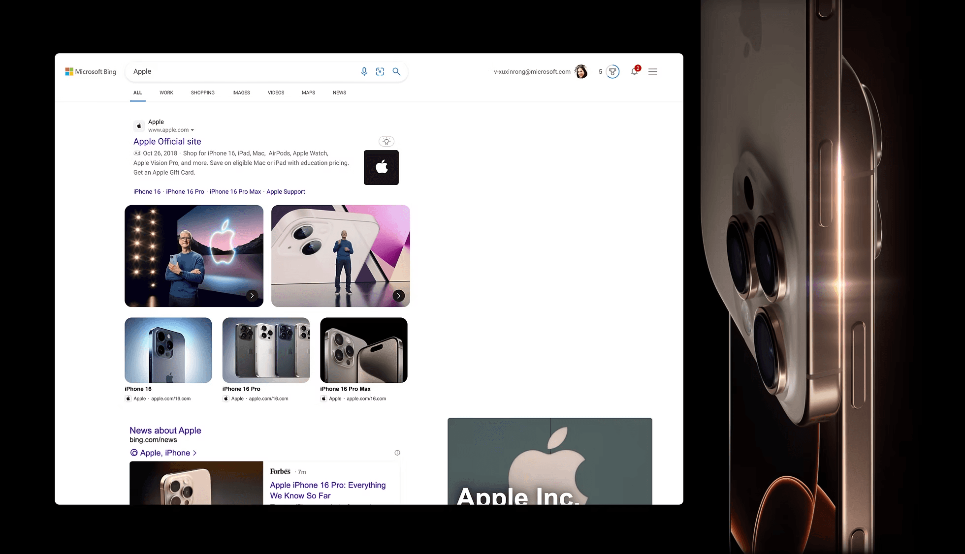For the Apple iPhone 16 launch in September 2025, Bing was tasked with creating a SERP takeover experience as part of the MLTA GoBig initiative. The goal was to design a high‑impact, visually engaging ad experience that maximized visibility, built anticipation, and provided seamless access to launch details and product information—driving traffic to Apple’s official site.